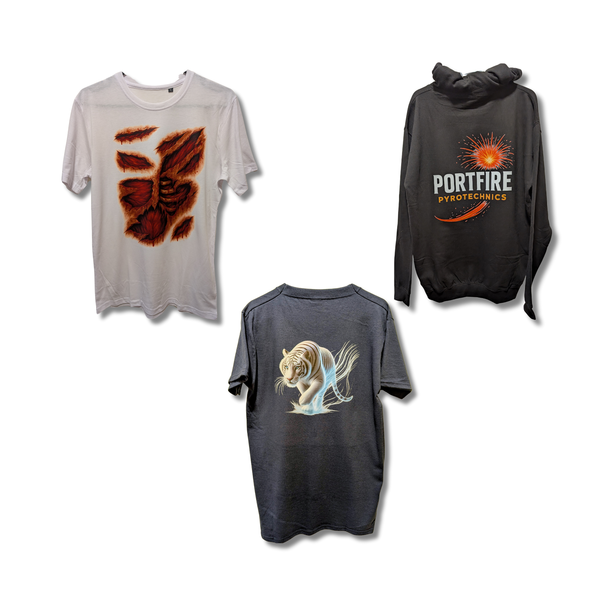 This collection includes a custom business hoodie for Portfire Pyrotechnics, a Halloween-inspired t-shirt featuring bold, fiery artwork, and a striking white tiger tee showcasing fine detailing and gradient shading through precision HTV and sublimation techniques.