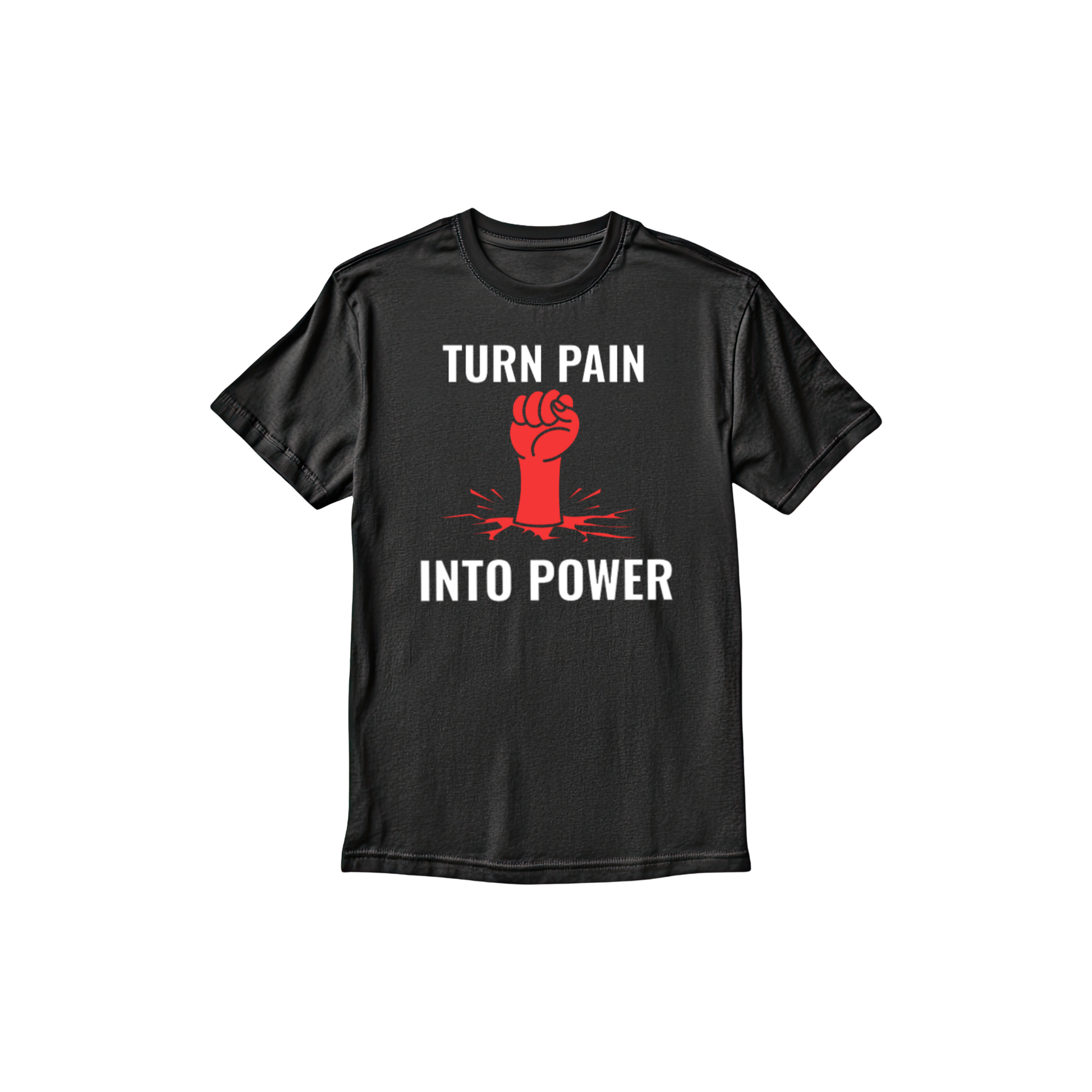 ✊ Front: “Turn Pain Into Power” with a striking red fist graphic breaking through the surface.